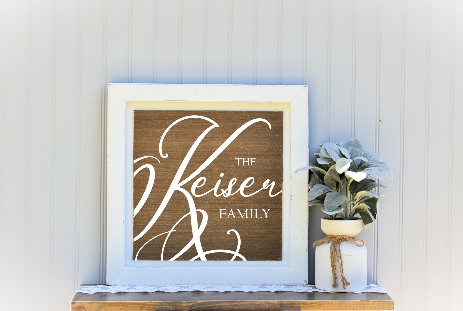 The frame is made of solid pine wood. That is sanded, stained and painted white. We distress the edges, exposing the stain under for a vintage/distressed/rustic look. The frame then gets a satin poly seal coat that allows for the frame to be wiped down if needed. The inside plaque is stained, and then painted to your choice of color and also distressed and sealed. We sand between all layers to ensure a smooth finish and non peeling adhesion to the layer below. A sawtooth hanger is added to the back so you can use at an event on an easel and then display in your home after.