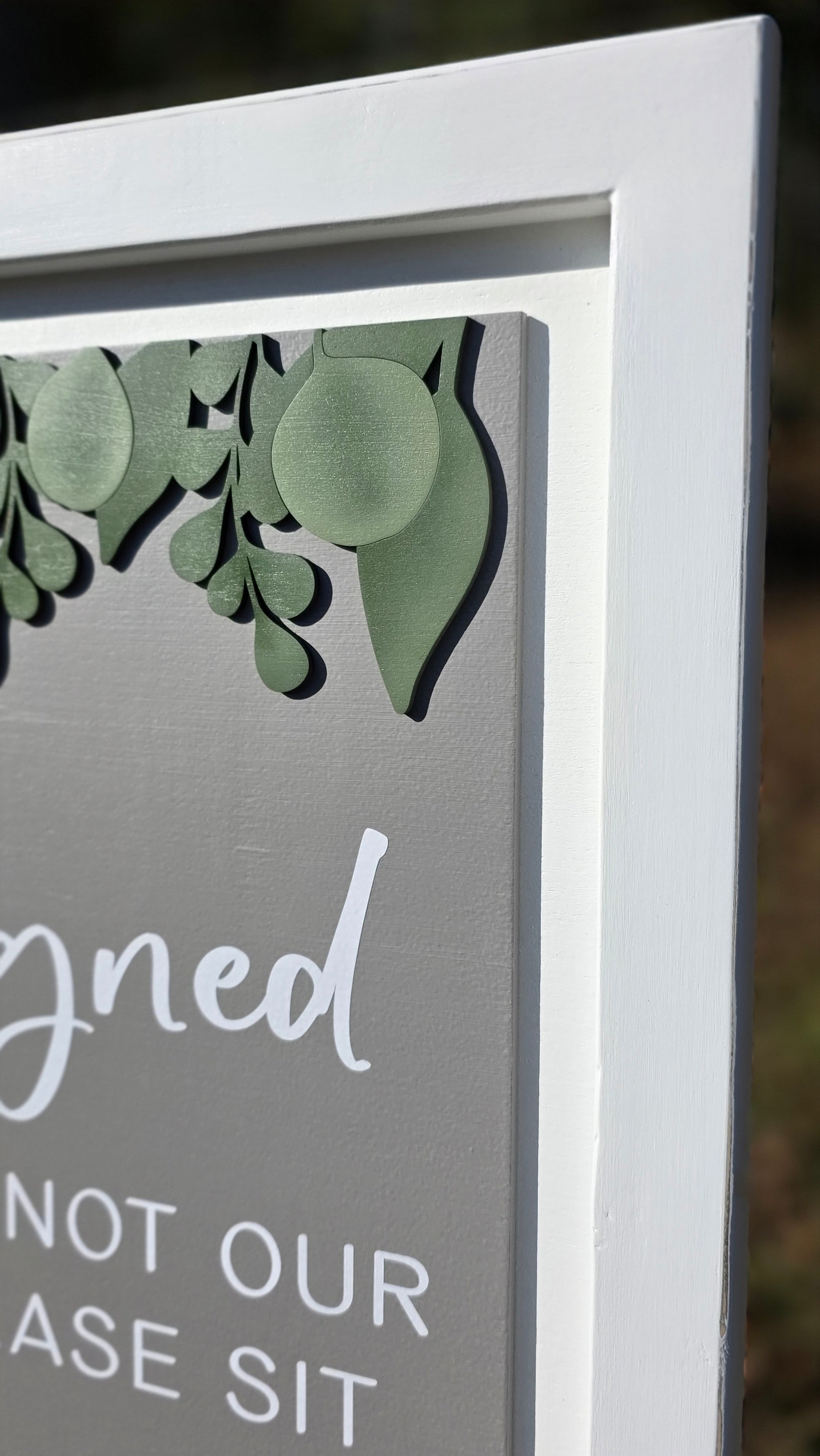 Open seating wedding sign in a handcrafted white frame with distressed edges for a modern rustic feel. The eucalyptus accent across the top is laser cut wood that has been air brushed and varnished. The lettering is done using permanent adhesive white glossy vinyl. Background color is a medium gray chalk paint that is sealed and varnished. Beautiful piece to match many themes! This won't last long! Ready to ship today.