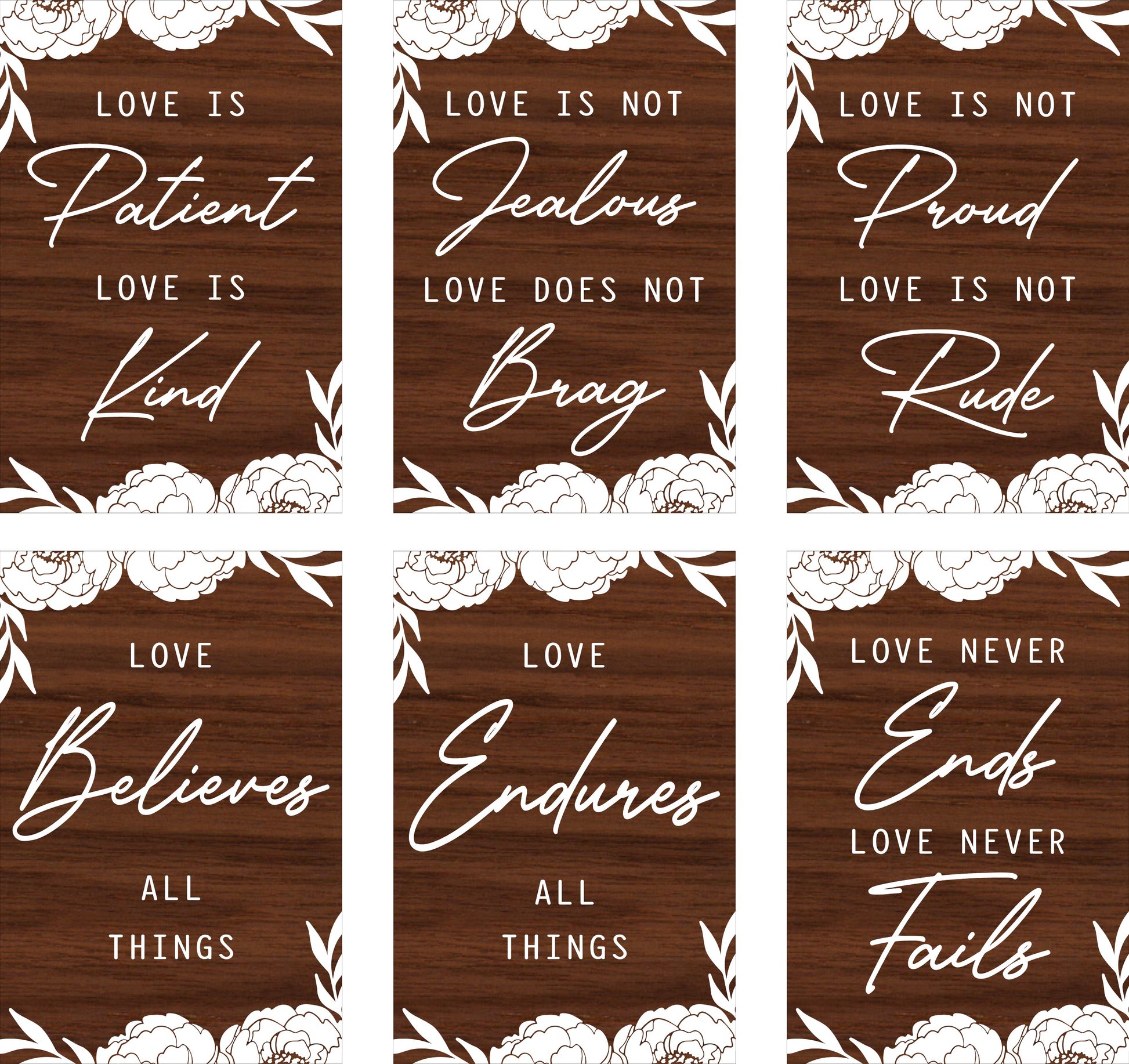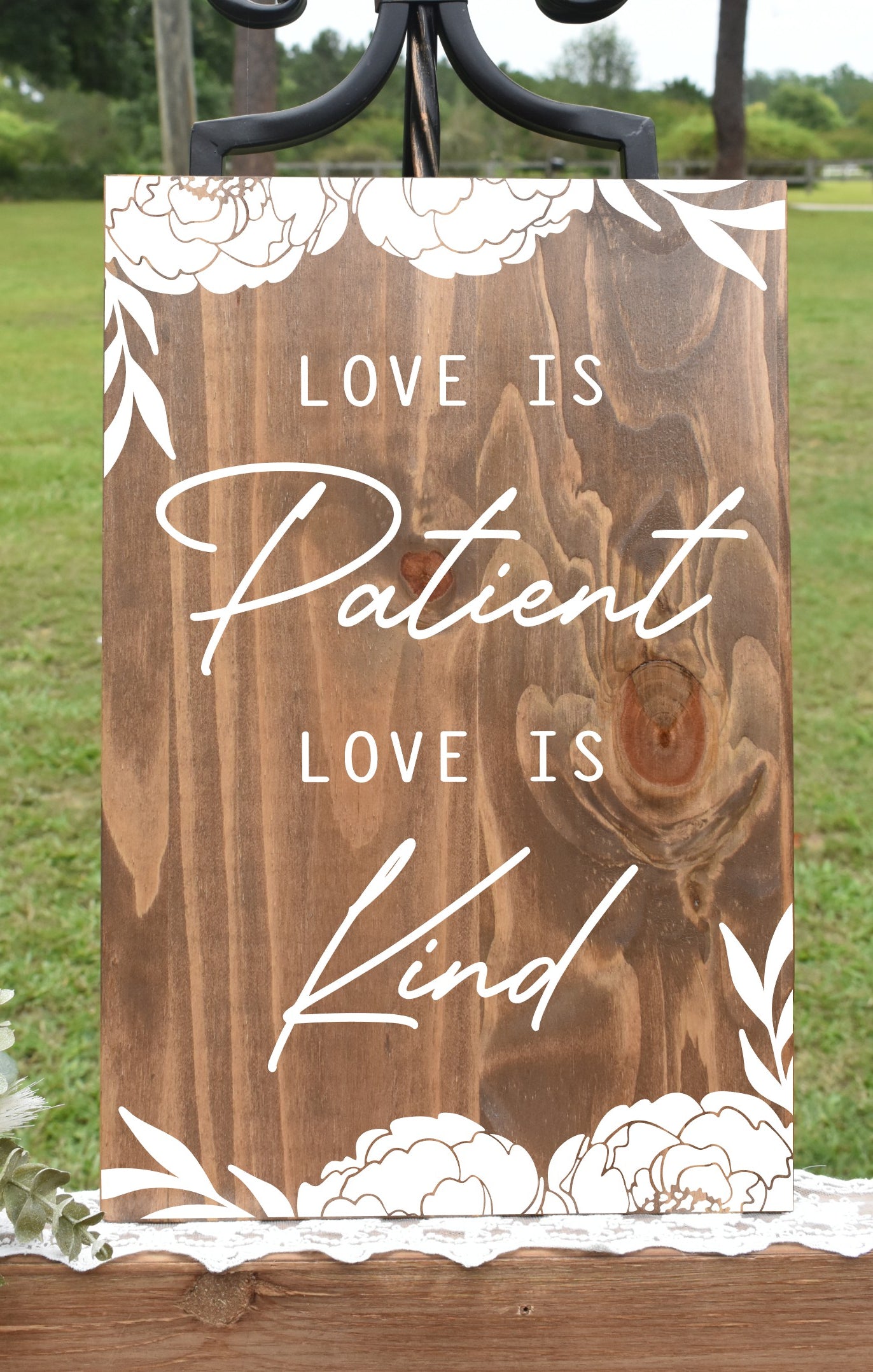 Love is Patient, Love is Kind with floral and leaf accent graphics.