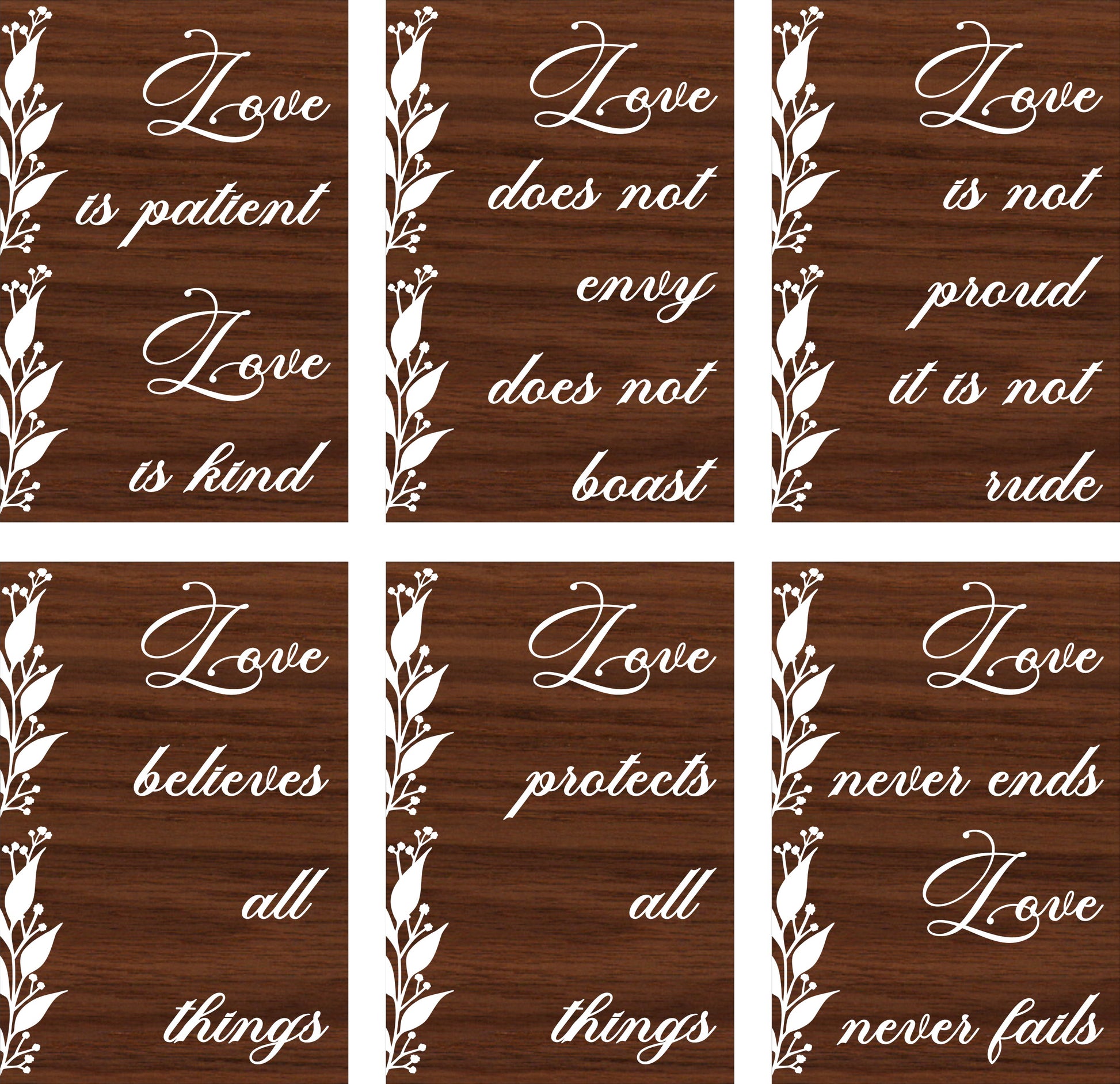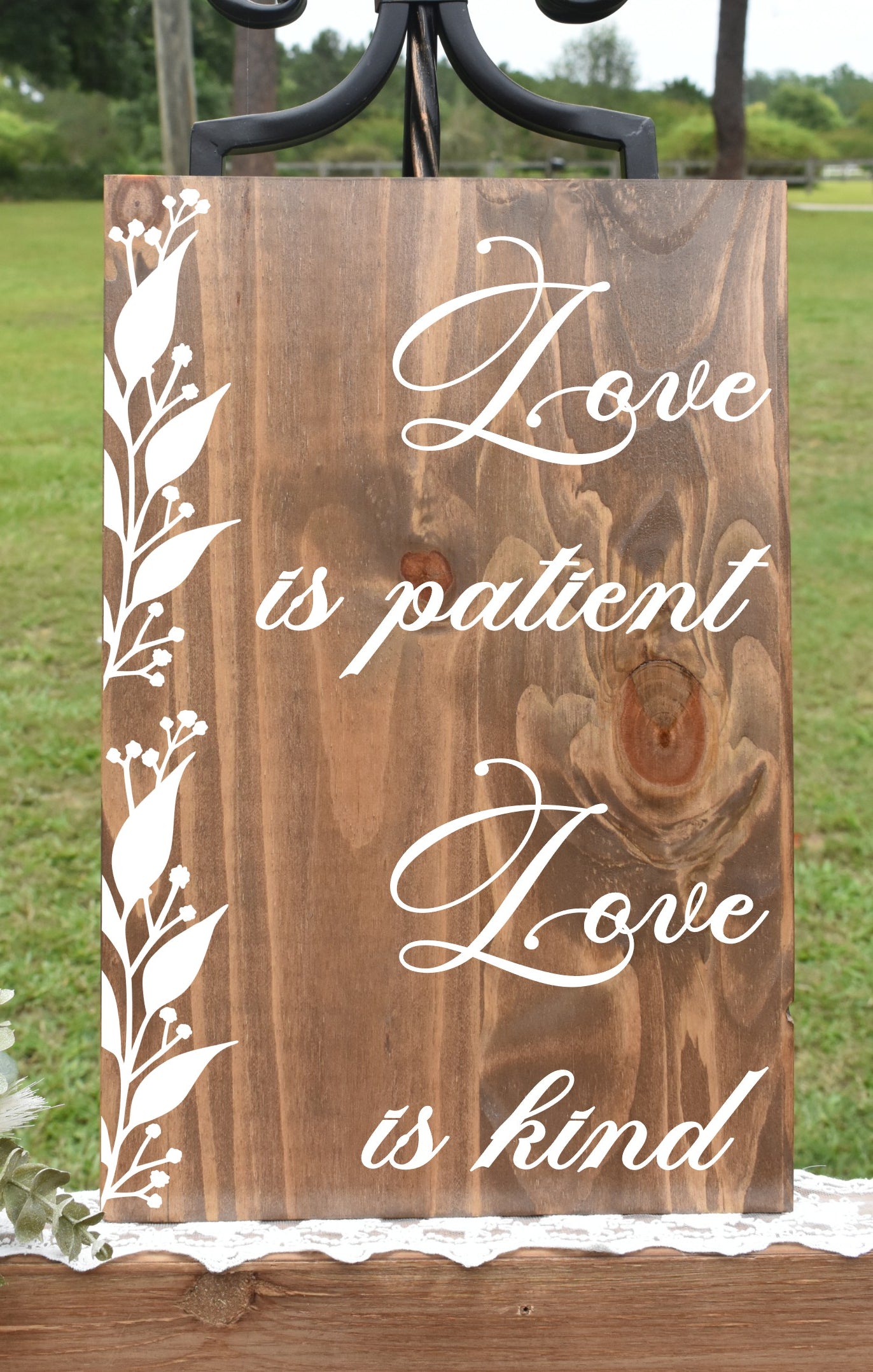 Love is Patient, Love is Kind with leaf and gypsophila accent graphics.