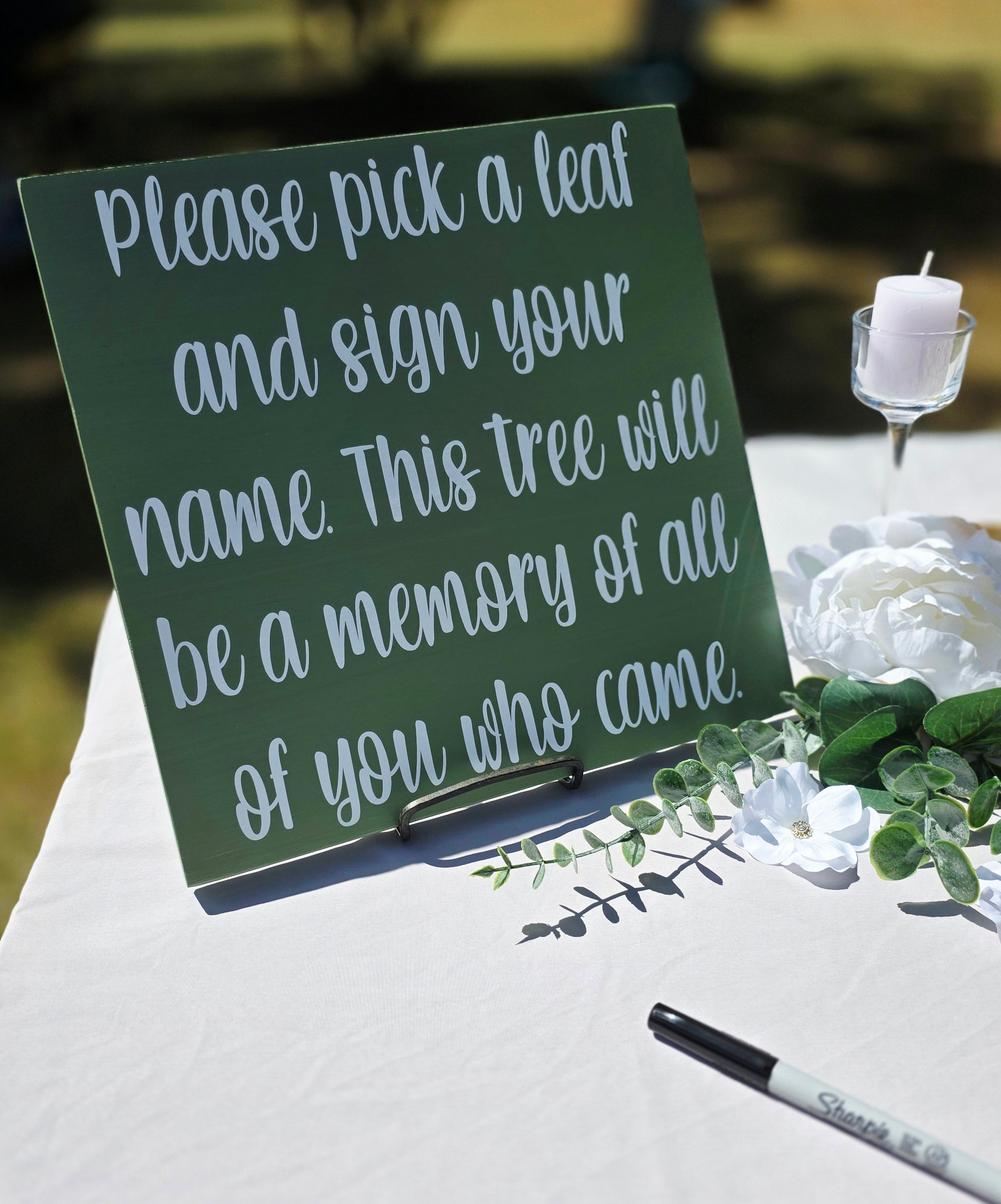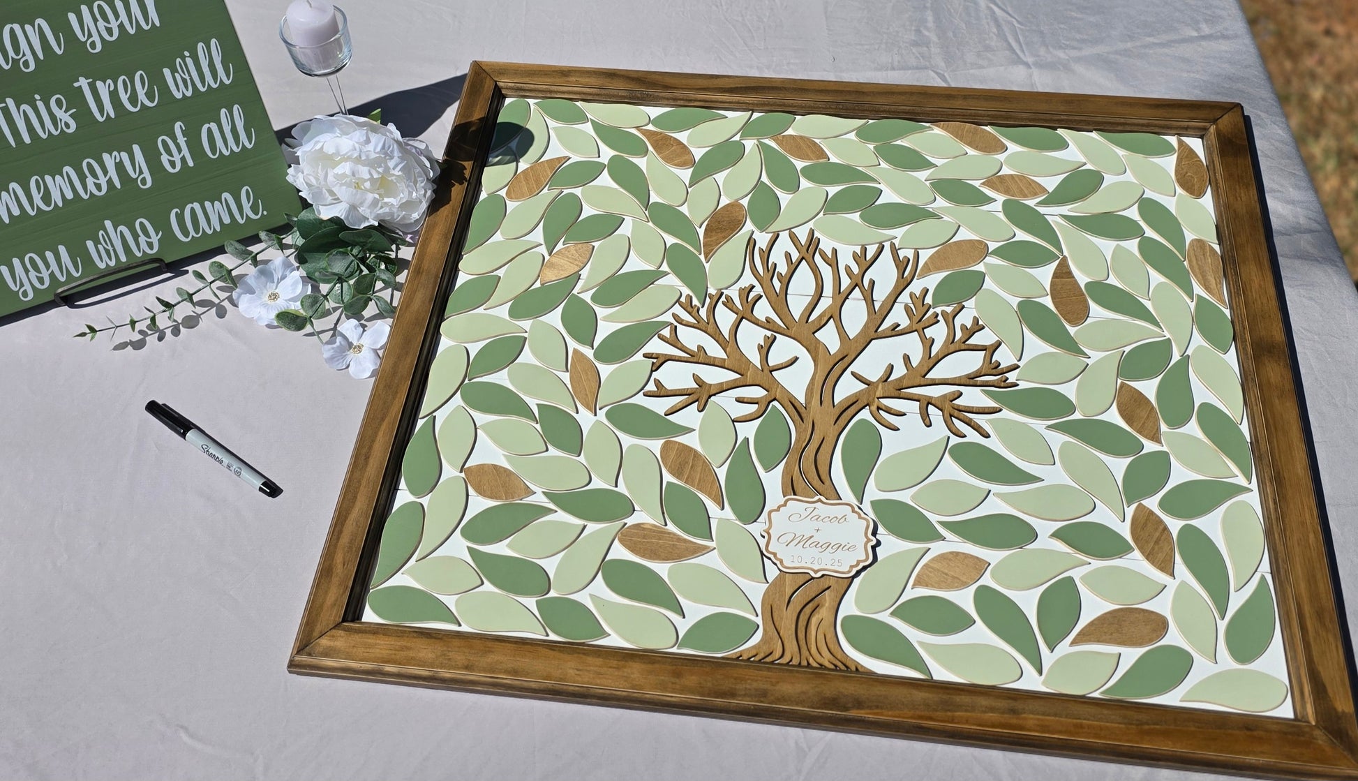 Each order includes the framed sign with your desired amount of leaves already assembled and hardware on the back to hang after your wedding, a 12x12 decorative instruction sign and a fine tipped sharpie.