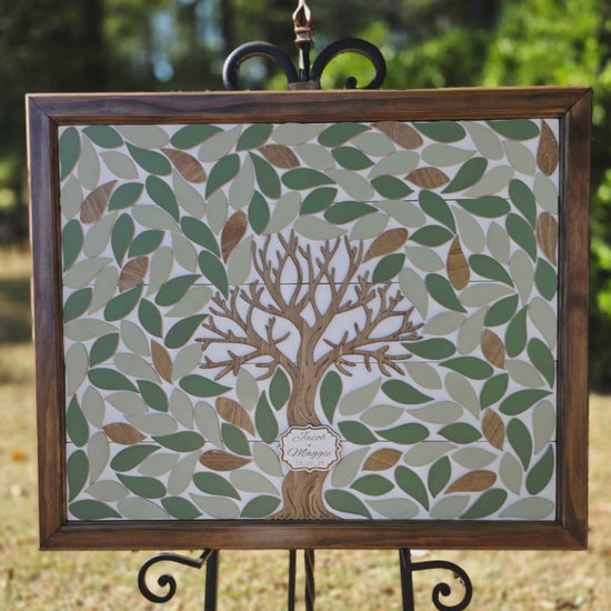 Our guest tree framed wedding sign is an alternative wedding guestbook that allows you to create a long lasting keepsake from your wedding day. Our handcrafted frames accentuate the white shiplap with a large tree in the center. The leaves become a platform for guests to sign their names. A small plaque sits in the center of the tree trunk and is personalized for the couple with the wedding date.