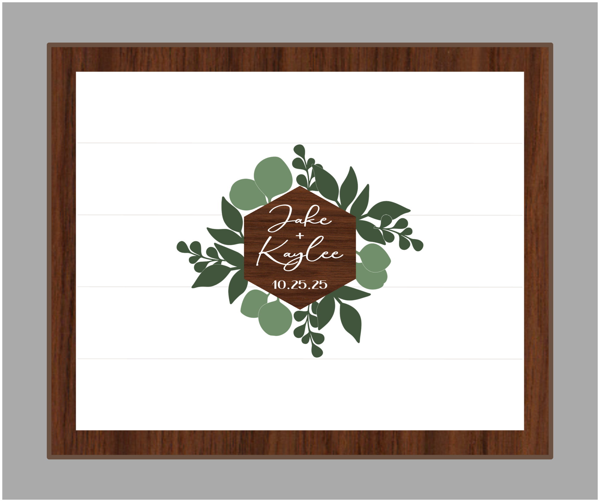 Our guestbook framed wedding sign is an alternative wedding guestbook that allows you to create a long lasting keepsake from your wedding day. Our handcrafted frames accentuate the white shiplap background. In the center, we have a wood hexagon stained to match the frame. Around the hexagon we have added laser cut leaves and eucalyptus painted in various greens so everything stays neutral. We add your personalization to the middle of the hexagon in white glossy permanent adhesive vinyl. You can choose to hang your first names and date, your monogram or just your new last name with the date. (**there is a note section during checkout where you can add this information for us or send us an email with your order number and personalization request.**) Your guests can sign all around the hexagon to create a beautiful and unique keepsake that can hang in your home for years to come.